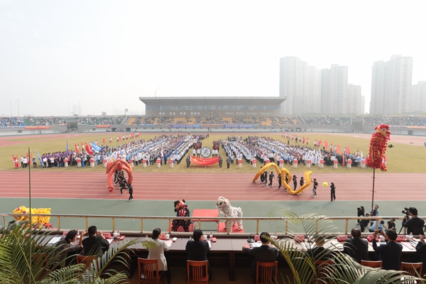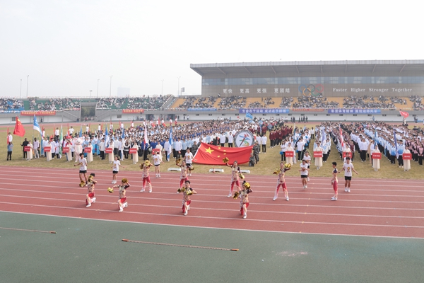 伴随着雄壮的《运动员进行曲》,国旗护卫队、校运动会会徽队以及全体裁判员、运动员迈着整齐的步伐,精神饱满地步入运动场。各代表队的方阵依次走过主席台前,向师生们展现着青春风采。