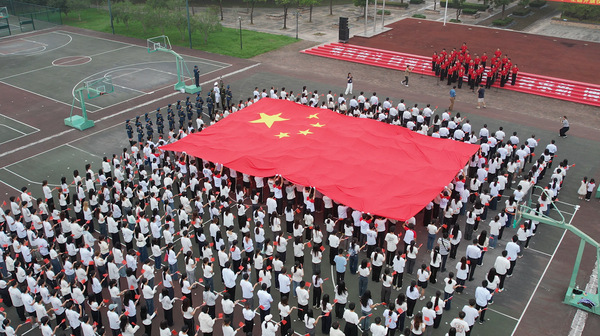 国旗护卫队英姿飒爽,迈着铿锵有力、整齐划一的步伐护卫国旗入场。在庄严的国歌声中,五星红旗冉冉升起,迎风飘扬。全体师生肃穆而立,齐声高唱国歌,向国旗行注目礼。